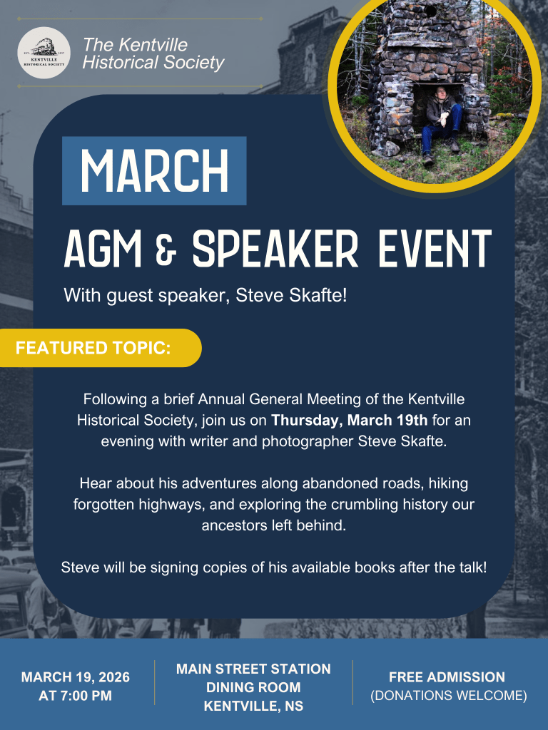 DETAILS: Join us on Thursday, March 19th at 7PM for a brief Annual General Meeting of the Kentville Historical Society, followed by a talk with local writer and photographer, Steve Skafte!
