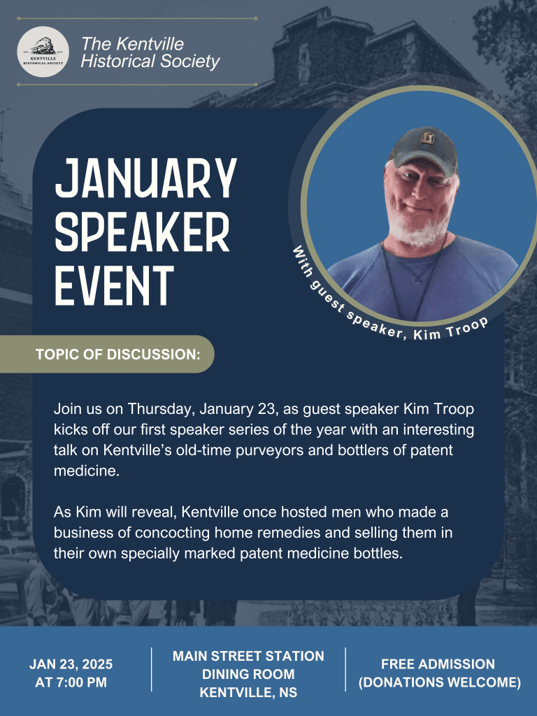 DETAILS: Join us for the first speaker event of the year as Kim Troop talks about Kentville’s old-time purveyors and bottlers of patent medicine.