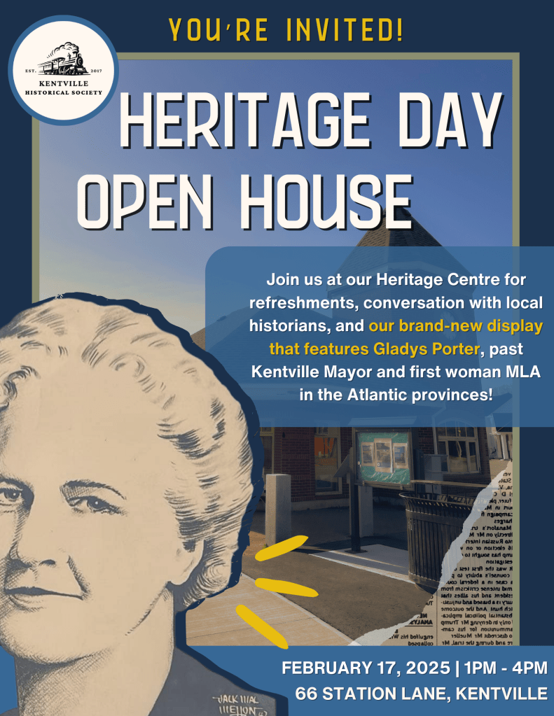 DETAILS: Celebrate Heritage Day with the Kentville Historical Society! We’ll have refreshments and a brand-new display on Gladys Porter — Kentville’s first woman MLA in the Atlantic provinces.