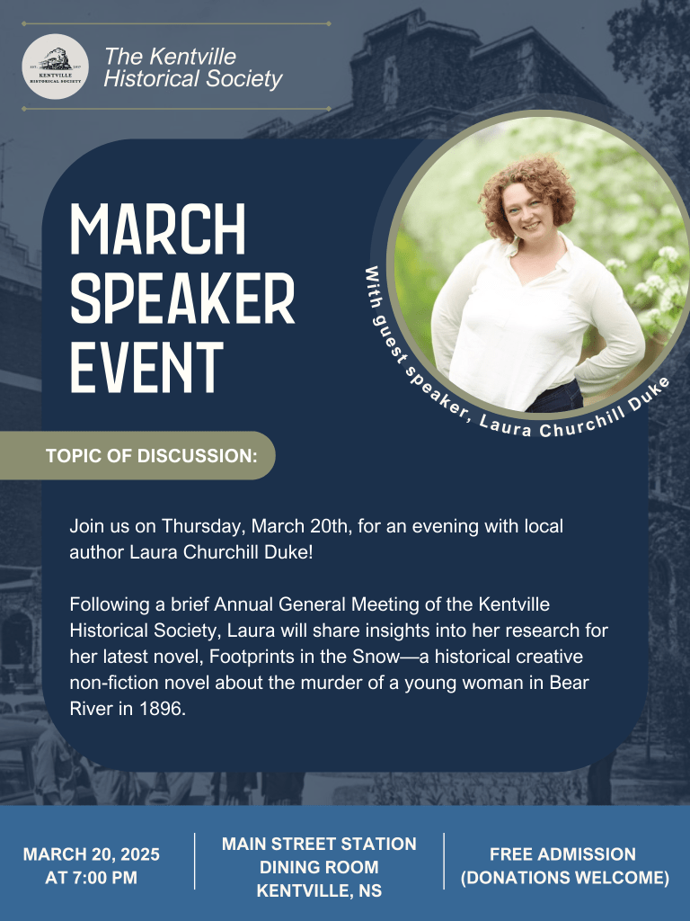 DETAILS: Join us for an evening with local author, Laura Churchill Duke! Laura will be sharing her research behind her latest novel, Footprints in the Snow—a historical non-fiction about the murder of a young woman in 1896. The jury trial was held at the Supreme Court building in Kentville.