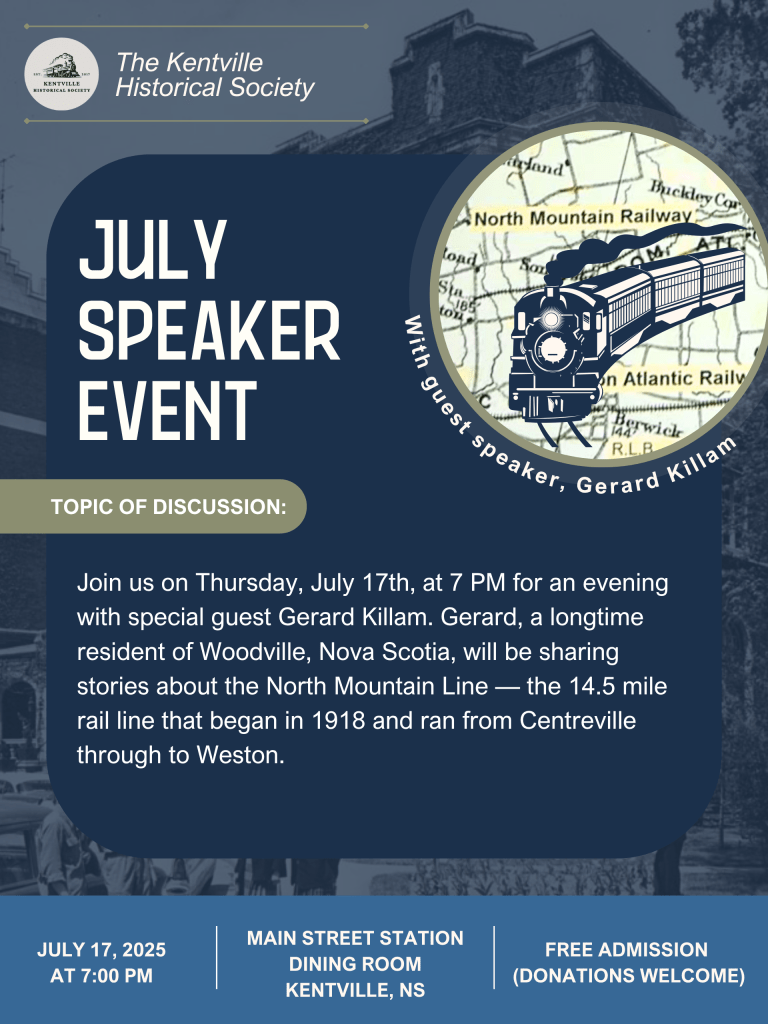 DETAILS: Join us on Thursday, July 17th at 7 PM as guest speaker Gerard Killam shares stories about the North Mountain Line, the 14.5 mile rail line that ran from Centreville to Weston!