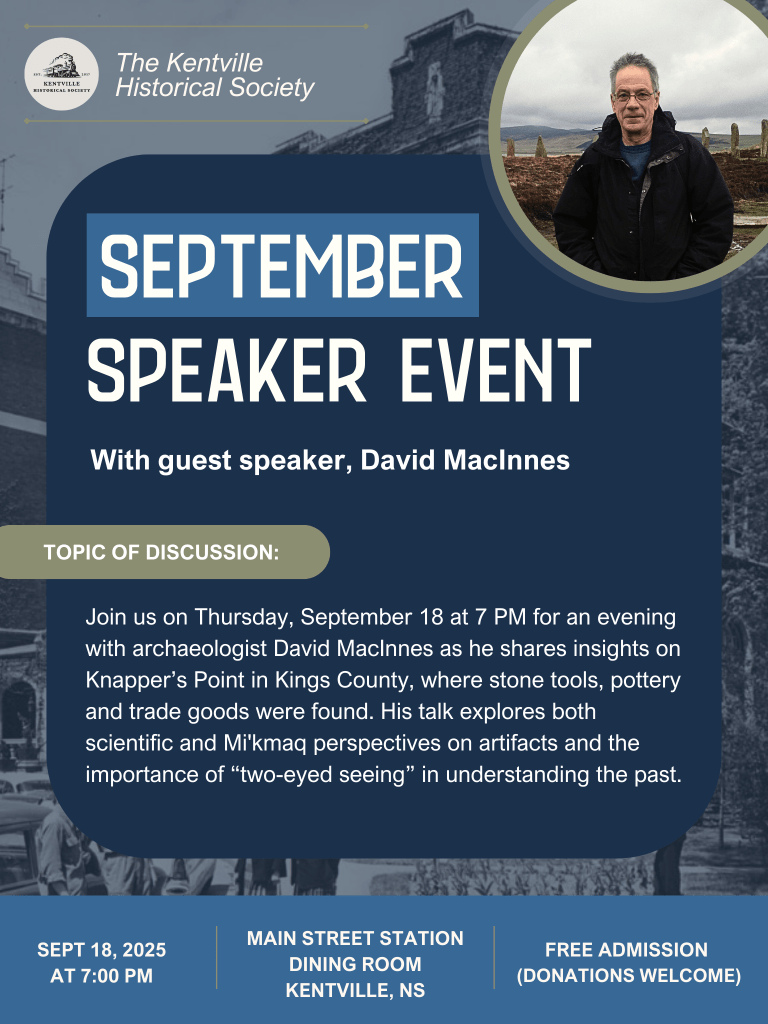 DETAILS: Join us on Thursday, September 18 at 7 PM as guest speaker David MacInnes speaks about Knapper’s Point in Kings County where stone tools, pottery, and trade goods were found!