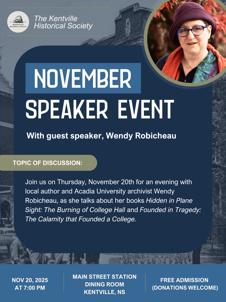 DETAILS: Join us on Thursday, November 20th for an evening with author and Acadia University Archivist, Wendy Robicheau, as she speaks about her books “Hidden in Plane Sight: The Burning of College Hall” and “Founded in Tragedy: The Calamity that Founded a College.”